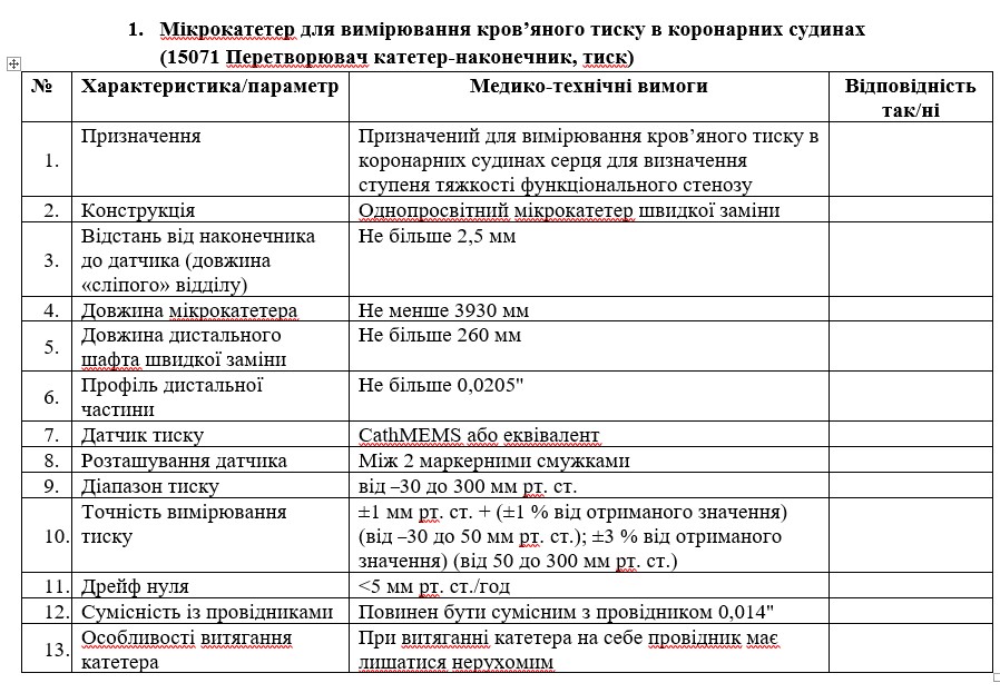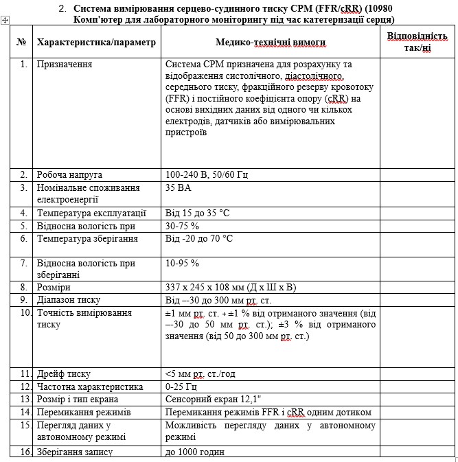 Запрошення до подання комерційних пропозицій на поставку Системи вимірювання серцево-судинного тиску СРМ (FFR/cRR) та Мікрокатетеру для вимірювання кров’яного тиску в коронарних судинах Шановний постачальник! Цим оголошенням запрошуємо Вас подати свою Комерційну пропозицію на постачання медичного обладнання, яке складається з наступних позицій: 1. Мікрокатетер для вимірювання кров’яного тиску в коронарних судинах (15071 Перетворювач катетер-наконечник, тиск) в кількості 1 штука; 2. Система вимірювання серцево-судинного тиску СРМ (FFR/cRR) (10980 Комп'ютер для лабораторного моніторингу під час катетеризації серця) в кількості 1 штука. З наступними медико-технічними вимогами: